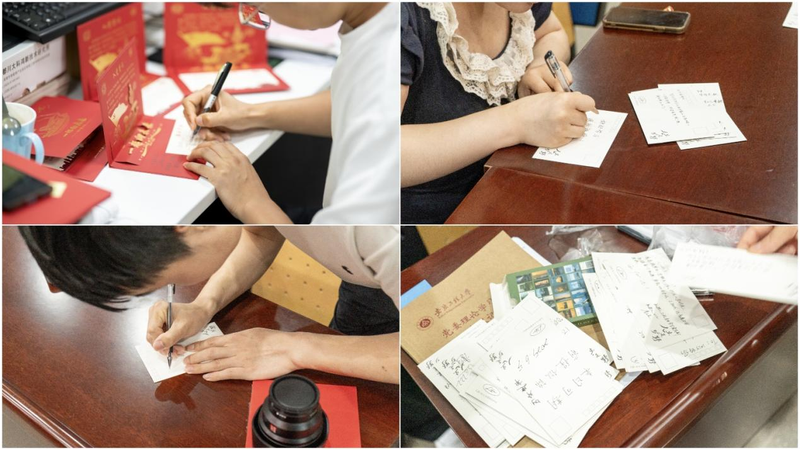 同写一封未来信笺。在“时光寄语”环节,毕业生党员在定制明信片上写下对2025级新生的寄语,投入“时光信箱”。这些满载祝福与期望的信笺,将在新生入学时传递,实现初心与梦想的跨时光传承。