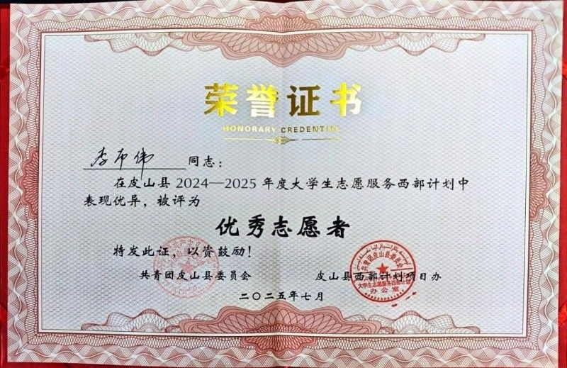 近日,根据和田地区西部计划项目办工作部署,结合各服务单位意见,对2024-2025年度在岗大学生西部计划志愿者开展综合考评工作。我院2024届毕业生李布伟成功入选,荣获2024-2025年度优秀西部计划志愿者。