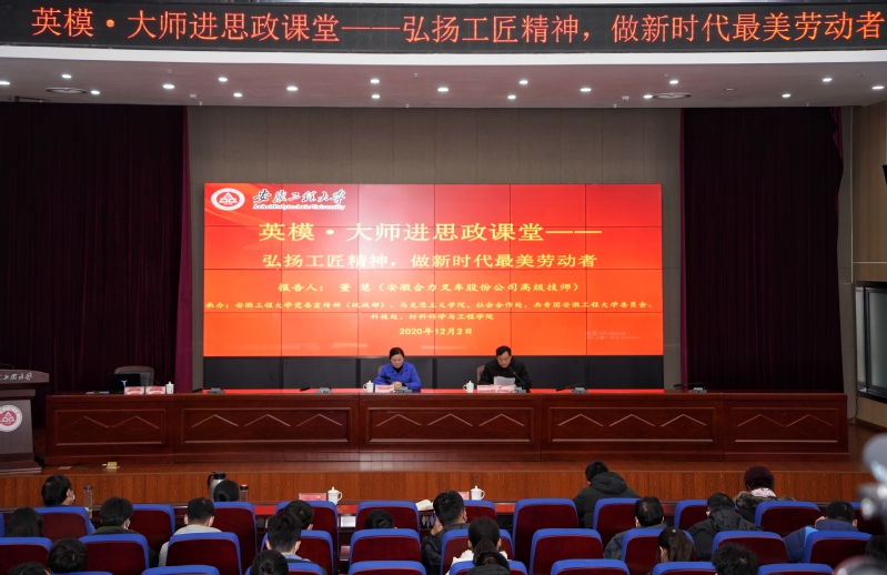 122日下午,由我校举办,校党委宣传部、马克思主义学院、社会合作处、校团委、科技处、材料科学与工程学院联合承办的“英模·大师进思政课堂”主题报告在图书馆五楼会议室举行。“全国劳动模范”“中华技能大奖”“全国技术能手”“全国三八红旗手”等荣誉获得者、安徽合力叉车股份公司高级技师、安徽省机械冶金工会副主席董慧走进思政课堂,为我们带来“弘扬工匠精神,做新时代最美劳动者”的专题讲座。校党委常委、宣传部部长、马克思主义学院党总支书记孙浩然主持报告会。马克思主义学院全体师生以及来自材料科学与工程学院的300余名大学生聆听报告会。