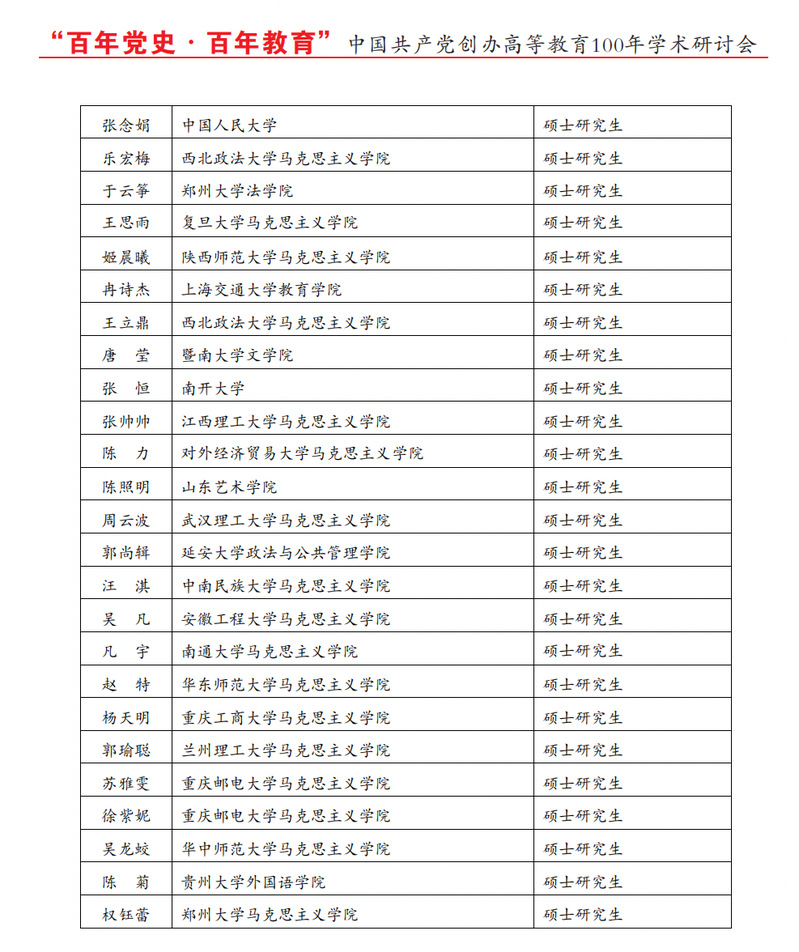 10月8日,由北京大学、清华大学、中国人民大学、天津大学、华东师范大学、上海大学联合主办,上海大学承办,中国银行协办的“百年党史·百年教育”中国共产党创办高等教育100年学术研讨会召开。经过专家严格评审,最终共有106位嘉宾、专家学者与学生代表获邀参会。我院2020级硕士研究生吴凡同学提交的论文《恽代英引导青年价值观嬗变的逻辑进路——以〈中国青年〉(1923-1927)为例》入选论文集,并获邀参加此次研讨会。因疫情防控要求,活动以线上视频会议的形式举行。