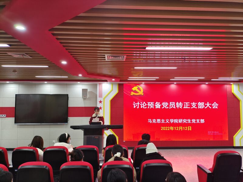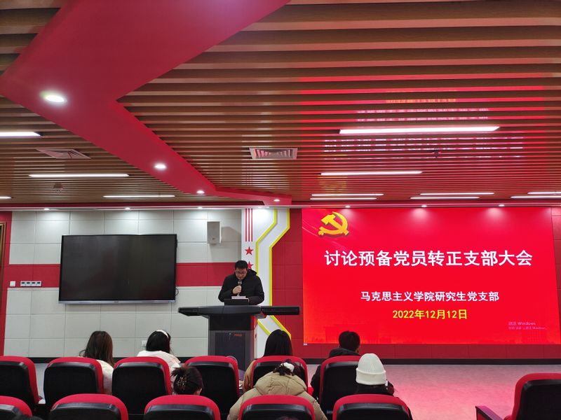 2022年12月12日,马克思主义学院研究生党支部在图书综合楼1409会议室召开支部会议,讨论预备党员转正事宜。会议由支部书记裴利萍主持,支部全体党员参加。
