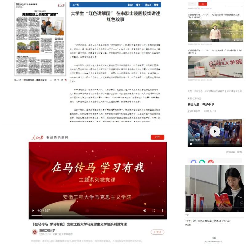 宣讲实践中,内容聚焦三大主题板块。铸魂固基——扎实推进马克思主义基本原理宣讲,以《马克思恩格斯选集》等内容为重点开展,实现马克思主义深入人心、落地生根;多方合作,做大做强习近平新时代中国特色社会主义思想和党的二十大精神宣讲——学院20名宣讲团成员加入校团委“青年讲师团”,紧扣二十大报告原文,从二十大报告的背景和框架层面到二十大提出的一系列新观点、新论断、新思想、新战略、新要求,以青春视角讲述党的二十大精神;此外,宣讲团依托学院皖江红色文化研究中心平台,成立“红色文化讲解团队”,将本土故事融进理论内容,深入烈士陵园、中学等场所,将马毛姐、吕慧生、李家发、陈开元、吴赛男、杨士彬、张人亚、谢自道等一个个本土革命人物的故事娓娓道来。通过遴选一批、培养一批、锻炼一批的方式,宣讲团成员凝心聚力把马克思主义理论知识讲好,把党的二十大精神宣传贯彻好,把红色文化传承好。