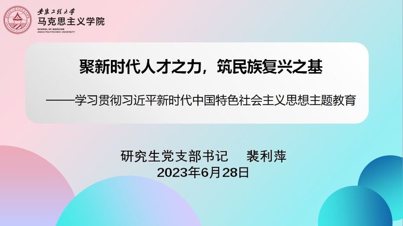 为深入学习贯彻党的二十大精神,扎实开展学习贯彻习近平新时代中国特色社会主义思想主题教育,6月28日,马克思主义学院研究生党支部书记裴利萍以“聚新时代人才之力,筑民族复兴之基”为题,通过线上方式为支部全体党员上了一堂深刻而生动的主题党课。