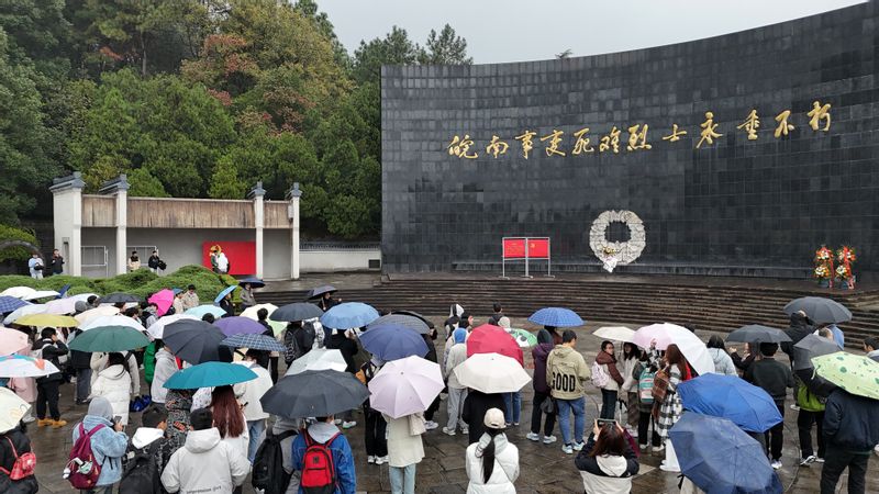 实践教学第一站:皖南事变烈士陵园。皖南事变烈士陵园位于泾县水西山,是1990年初为纪念皖南事变新四军将士殉难五十周年而修建。在讲解员的悉心讲解和带领下,老师和学生们参观纪念碑、纪念廊、无名烈士墓,了解了许多革命烈士事迹,感悟革命精神。随后献上花圈以缅怀先烈。