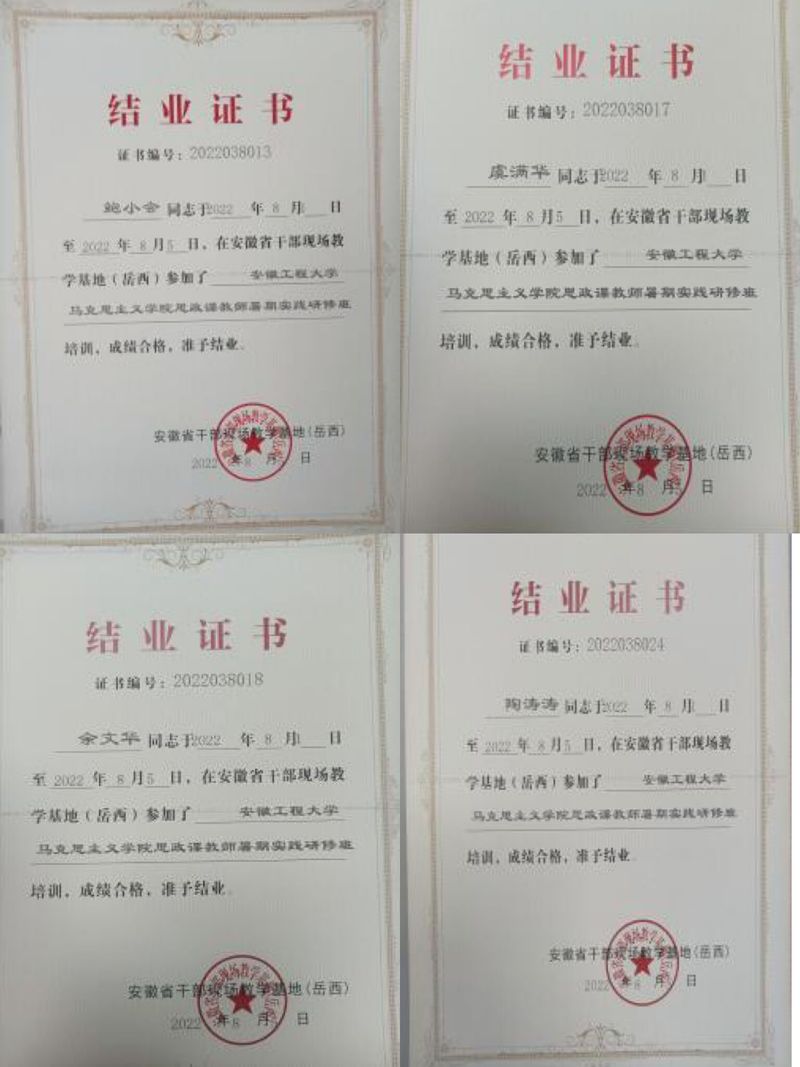 学习形式多样。一是通过QQ群、微信群等载体发布党的创新理论、时事内容,进行安全教育;二是通过“学习强国”、共产党员网、安徽先锋网等APP、微信公众号学习习近平新时代中国特色社会主义思想,开展“四史”教育;三是集中参加实践研修。2021年至2023年,支部党员分别赴嘉兴学院、贵州师范大学、岳西干部管理学院、延安大学开展实践研修活动。