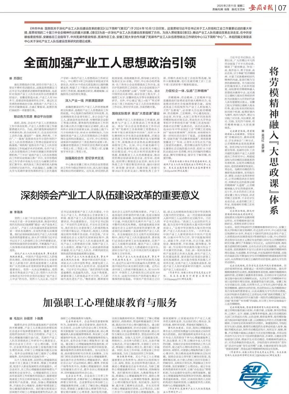 2月11日,《安徽日报·理论版》集中推介芜湖市产业工人队伍思想政治工作研究中心(以下简称“研究中心”)关于深化产业工人队伍建设改革的系列理论研究成果。