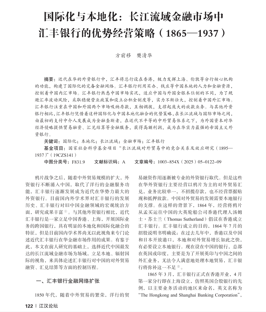 近日,马克思主义学院教师方前移在湖北社会科学院主办的《江汉论坛》(CSSCI来源期刊)2025年第5期上发表学术论文《国际化与本地化:长江流域金融市场中汇丰银行优势经营策略(1865-1937)》。