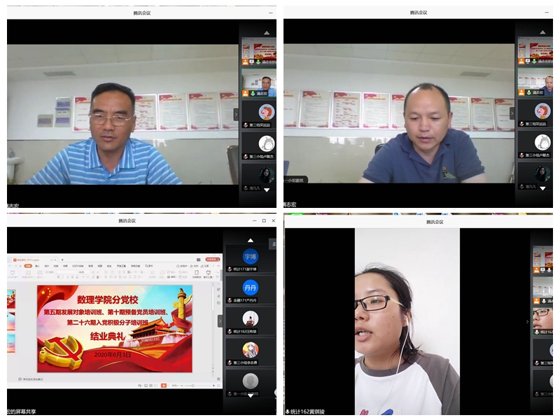 6月3日下午2:30,数理学院第五期发展对象培训班、第十期预备党员培训班和第二十六期入党积极分子培训班结业典礼于腾讯会议上顺利举行,数理学院分党校校长、党委书记周毅仁,副书记刘伟,培训班班主任及培训班129名学员参加了此次结业典礼。
