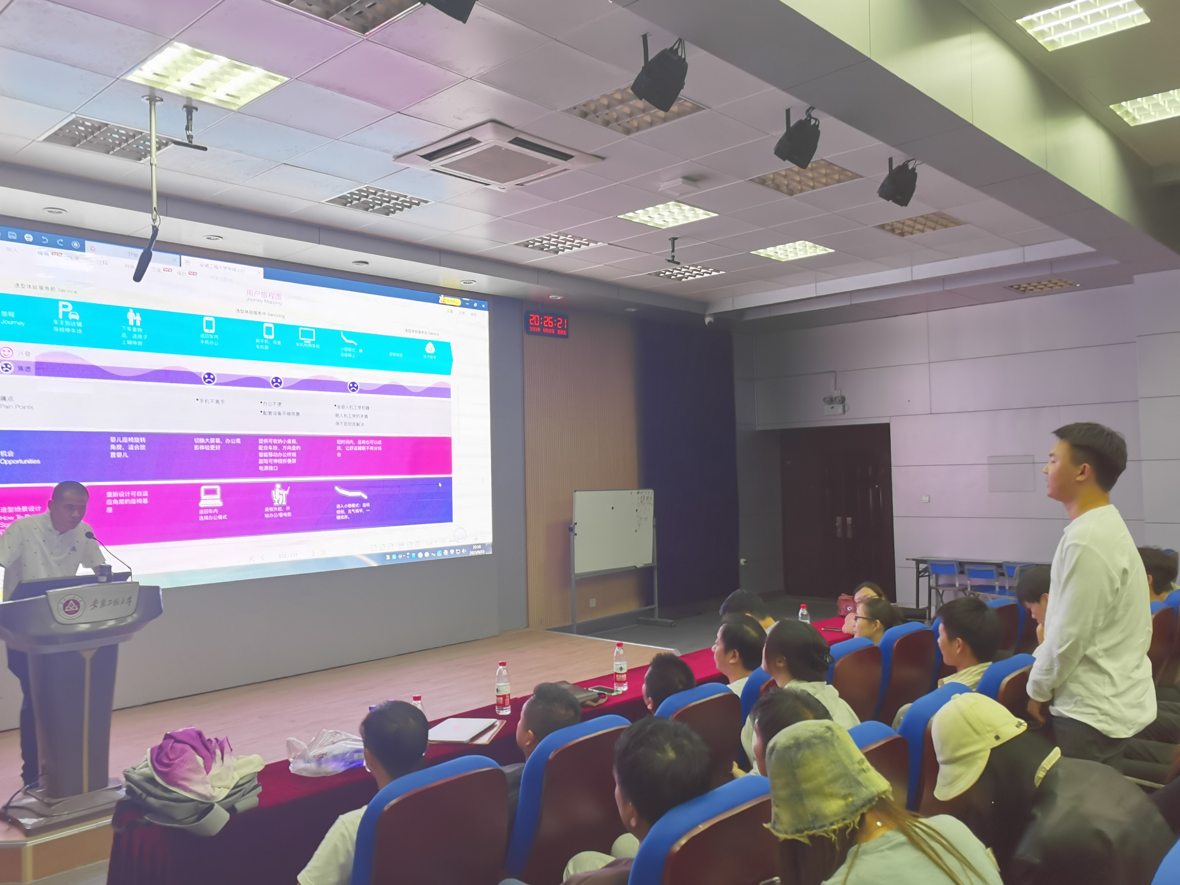 张乐乐首先分享了自己目前正在研发汽车造型设计项目,他围绕设计策略这一关键词,并通过设计策略的目的、设计策略的内容等展开讲授,通过分析自己获奖作品引发对设计策略的思考。同时还介绍了汽车设计前沿技术,特别是未来汽车设计新方向。最后,张乐乐结合自身工作和学习经历,鼓励同学们珍惜在校学习时间,制定好自己的学习规划,明确自己的发展方向,提升专业力和实践能力。
